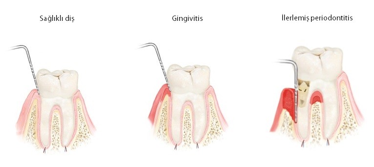 Zaman içinde diş yüzeyine tutunan dental plak diş eti seviyesinin altına uzanır ve iltihabı olayı yayar. Bu durum genellikle çok yavaş ilerler ve dişe destek olan kemiğin erimesi ile birlikte diş ile diş eti arasında, normalde çok sığ olması (1-2 mm.) gereken bir boşluk oluşumuna neden olur. Bu ‘periodontal cep’ İltihabın yayılması ile daha da derinleşir.