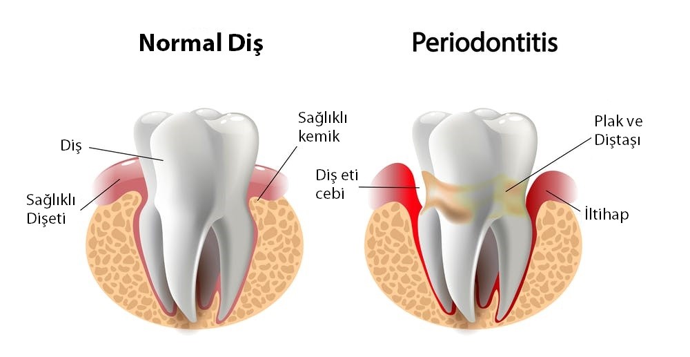 Periodontitis dişleri saran kemik ve diş eti dokularının iltihabıdır. Dişler ağız içinde görebildiğimiz kron kısmı ve kemik içine gömülmüş ‘kök’ten oluşmuştur. Kökler kemik için de ince lifler ile tutunmaktadır. Bunun yanında çene kemiğinin iç yüzünü saran pembe diş eti de dişin boyun kısmına yapışır. Diş eti iltihabı sadece gözle görülen diş etini değil, kemik dokuyu da etkileyeceğinden kontrol altına alınmayan bir diş eti rahatsızlığı sonuçta çürüksüz dişlerin sallanmasına ve çekilmesine neden olabilir.